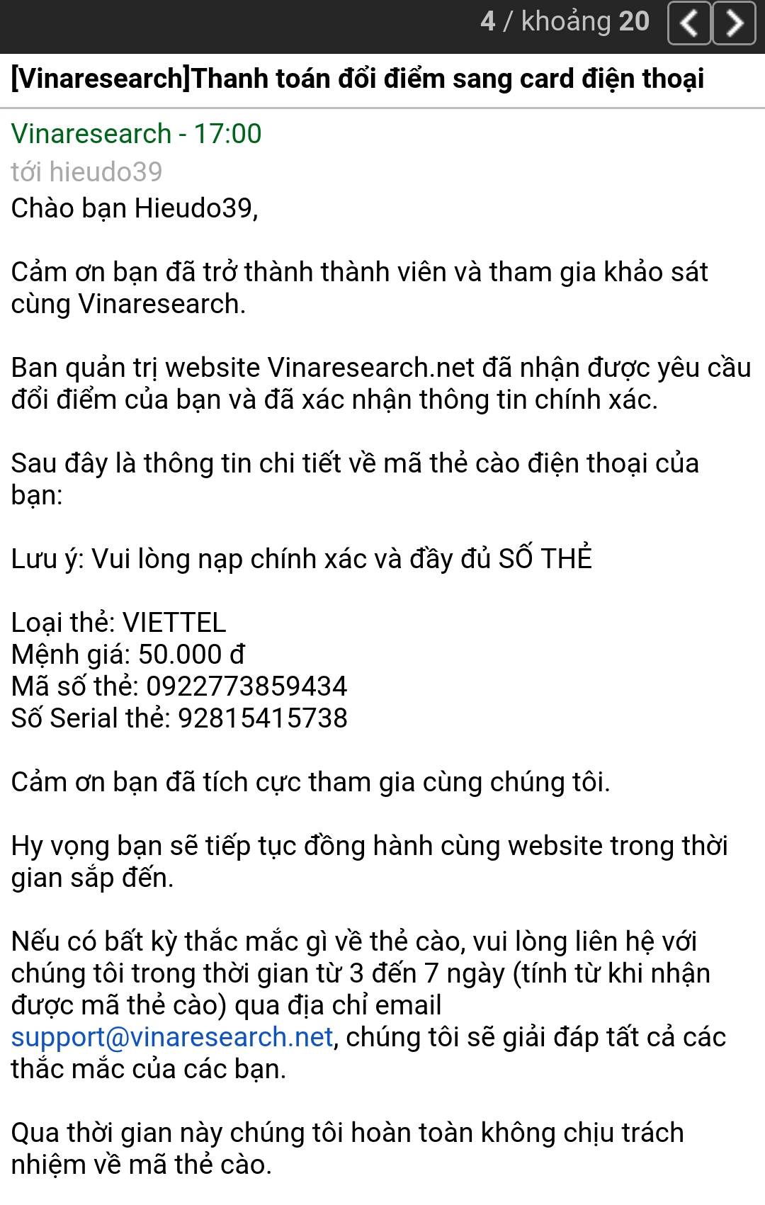 Vậy lên hôm nay xin giới thiệu các bạn một trang web kiếm tiền cho anh em nạp thẻ đăng ký mimax, nạp game, ...VinaResearch cho phép bạn rút tiền hay đổi thẻ cào khi bạn kiếm đủ 500 điểm tương ứng với 50k.