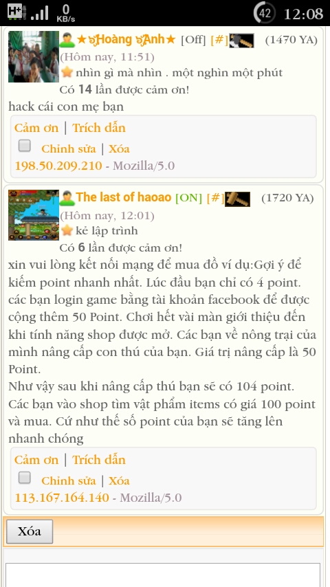 Đọc xem tiết >> Topic cảnh cáo và ban nick thành viênCấm nick [url=http://ya4r.net/users/profile.php?user=254]★๖ۣۜHoàng ๖ۣۜAnh★[/url] 7 ngày vì lý do xúc phạm thành viên khác. Đã có tiền sử xúc phạm BQT mà giờ còn tái phạm với thành viên khác, coi thường nội quy. Diễn đàn không chào đón thái độ này.