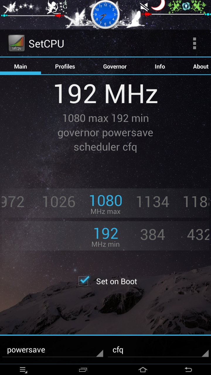 SetCPU là công cụ cho phép bạn thay đổi những thiết lập của CPU như xung nhịp, điện thế, ... nhằm nâng cao hiệu năng hoạt động hoặc giảm xung cho mục đích tiết kiệm pin chiếc điện thoại